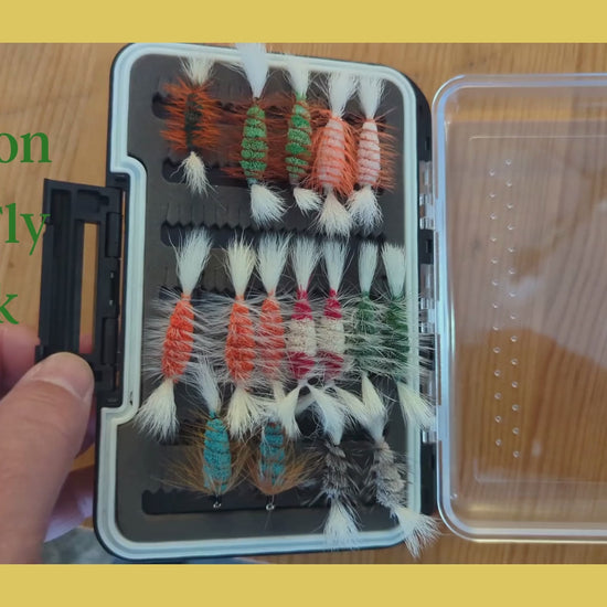 Atlantic Salmon Dry Fly Pack featuring bombers, bugs, and Wulffs—the ultimate selection for explosive dry fly action. Experience the thrill of surface takes as these proven patterns entice aggressive strikes from Atlantic salmon. Perfect for anglers seeking that heart-pounding moment when a salmon erupts at your fly.